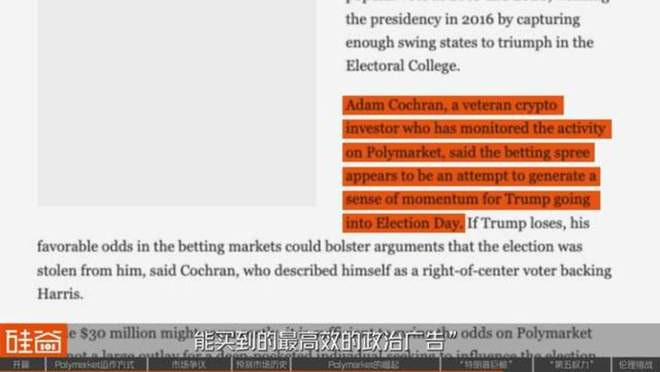 在华尔街日报的报道中,一位加密风险投资公司的合伙人AdamCochran就评论道:“这(指在Polymarket下注)是迄今为止能买到的最高效的政治广告。”