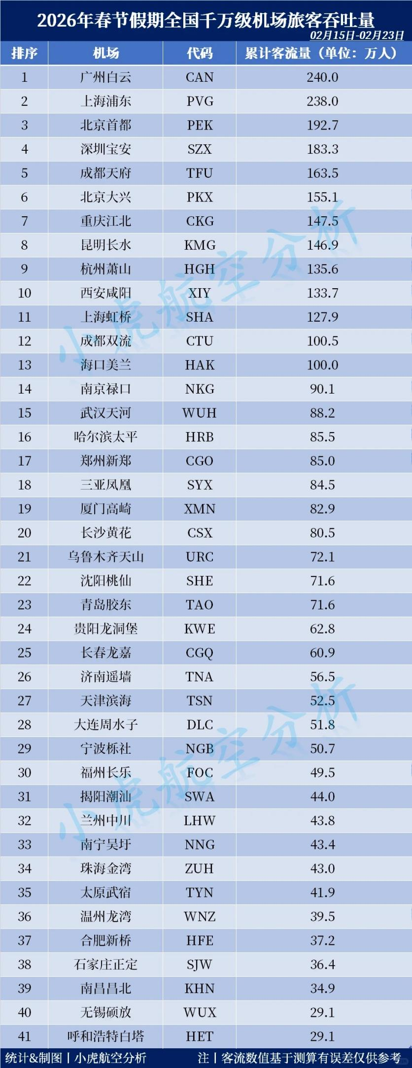 据“小虎航空分析”统计,今年春节假期,白云机场以240万人次的累计旅客吞吐量,超越去年同期冠军上海浦东机场的238万人次,站上全国千万级机场客流榜首。
