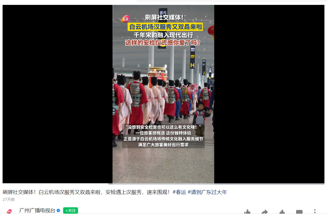此外,今年春节,白云机场打造的汉服秀,更是让旅客在航站楼就能沉浸式感受国风魅力。
